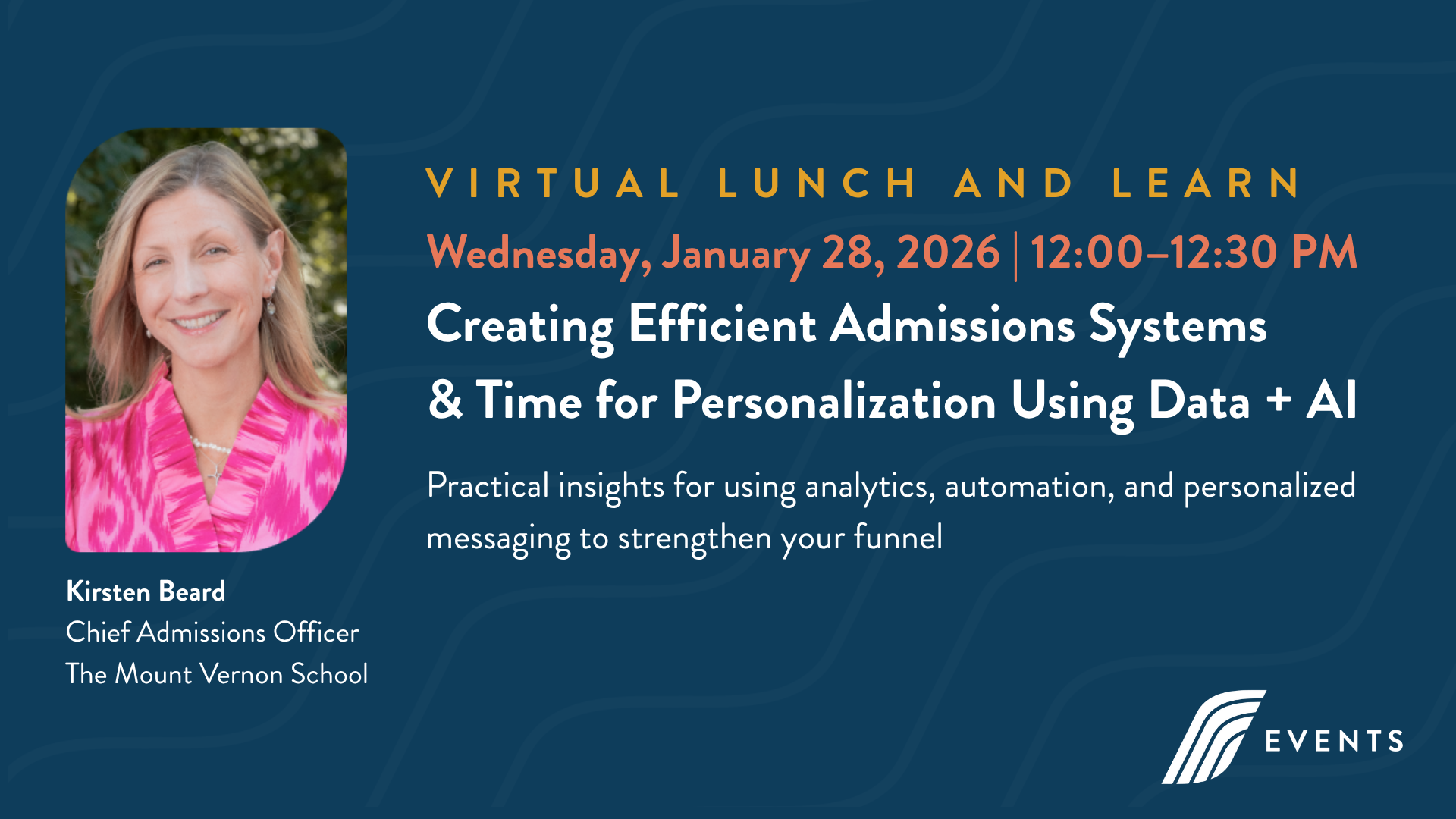 Admissions teams are busier than ever balancing data management, communication, and relationship building. In this session, Kirsten Beard will share how The Mount Vernon School efficiently manages over 1,400 inquiries and 500 applications annually—while still maintaining personal connections that convert prospects into their 200 new enrolled students. Learn how their strategic use of data and AI tools creates systems that free up time for what matters most: authentic family engagement. You’ll leave with practical insights for using analytics, automation, and personalized messaging to strengthen your funnel and streamline your workflows.